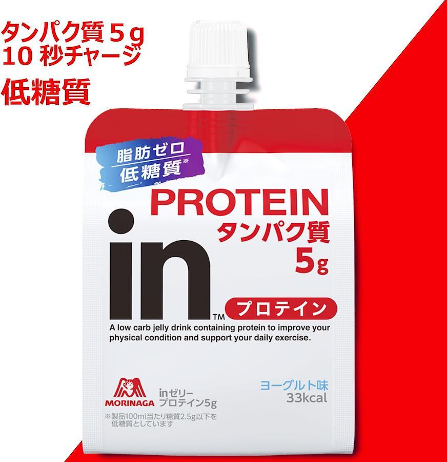 【プロテイン(タンパク質)を10秒チャージ】「inゼリー」シリーズはおいしく素早く目的のエネルギーや栄養素・水分を補給できる、飲むゼリータイプの栄養補助食品です。●すばやいタンパク質補給タンパク質5g(ホエイペプチド5,000mg)手軽においしく補給できます。プロテインの働き強めるEルチン配合。減量時の補食や普段の食事でタンパク質量を増やしたい方に適しています。●スマート食習慣糖質2.2gで低糖質(※製品100mlあたり糖質2.5g以下を低糖質としています)脂質ゼロ(食品表示基準による)カロリー36kcalなるべくタンパク質のみを摂取したい、スマートな食習慣を志向する方に適しています。●フレーバー甘さを抑えたヨーグルト味。●飲用シーン(例):・小腹満たし、食事代わり、おやつに・毎日のコンディショニングに・アウトドアやスポーツ・フィットネス、アクティビティのお供に、水分補給に・仕事や勉強を頑張りたいとき、夜食に・いざというときの非常食に、ストックに 特徴: 【プロテインを10秒チャージ】 日々のコンディショニング・スポーツやフィットネスのお供に。1袋にプロテイン(たんぱく質)が5g入った栄養補給のためのゼリー飲料。 配合栄養素: ホエイペプチド、グルタミン酸、アラニン、パントテン酸、葉酸、ビタミンB6、ビタミンB1、ビタミンB2、ビタミンB12 味: ヨーグルト味 (Yogurt-flavored jelly drink) カロリー: 1個当たり 36kcal 内容量: 6個(6個入×1箱) 原材料に含まれるアレルギー物質(28品目中): 乳・大豆 原産国: 日本 (Made in Japan) メーカー: 森永製菓 株式会社 (MORINAGA & CO., LTD.)