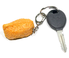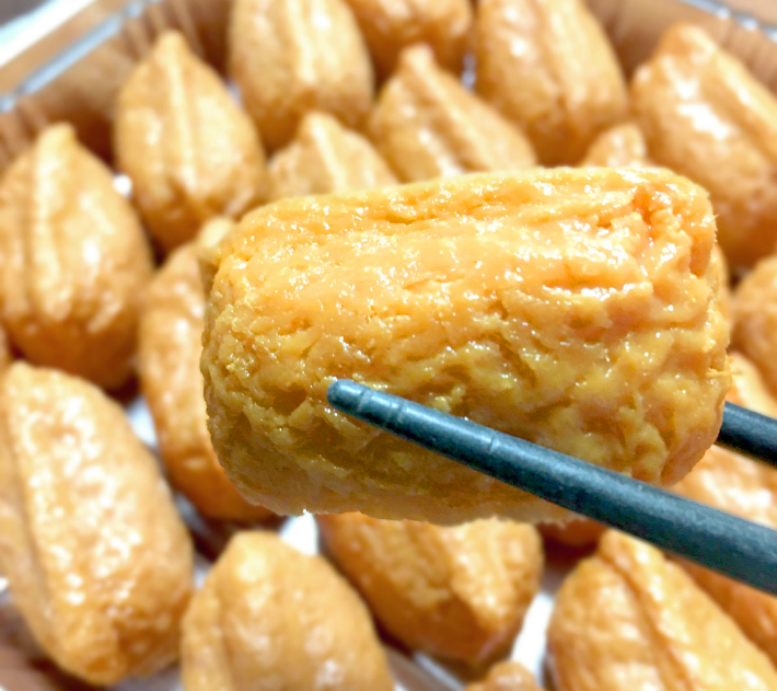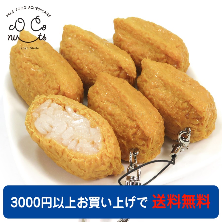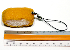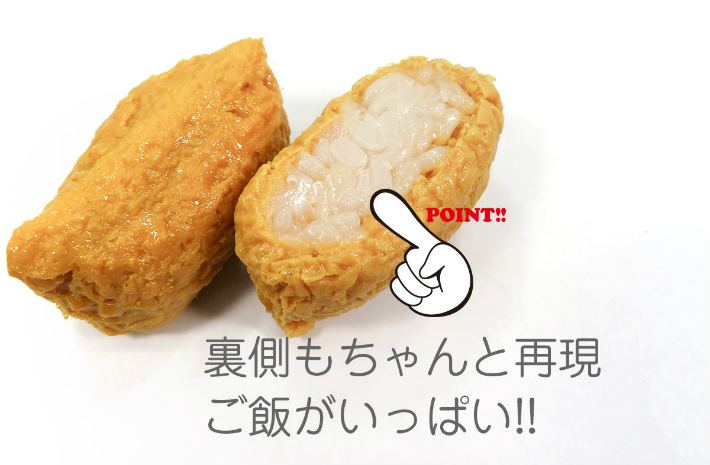 ちょっと小ぶりですが、本物そっくりないなり寿司の食品サンプルです。ご飯がたっぷり詰まった裏側もちゃんと再現しています。