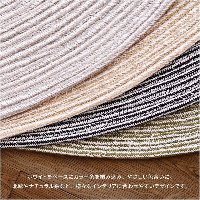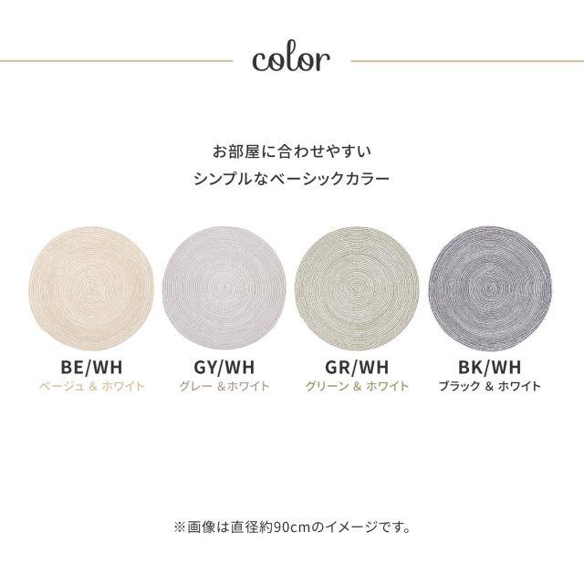 〈製品規格〉■サイズ:直径約90cm、直径約140cm、直径約160cm、直径約180cm■カラー:ベージュ/ホワイト、グレー/ホワイト、グリーン/ホワイト、ブラック/ホワイト■生産地:インド■素材・成分:素材:綿100%※洗濯機で洗えます。(ドラム式不可)ホットカーペット・床暖房対応。