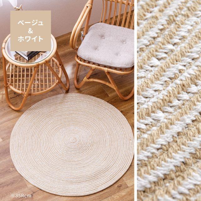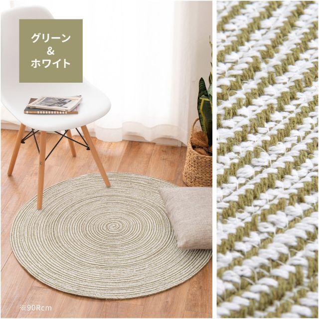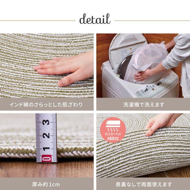 〈製品規格〉■サイズ:直径約90cm、直径約140cm、直径約160cm、直径約180cm■カラー:ベージュ/ホワイト、グレー/ホワイト、グリーン/ホワイト、ブラック/ホワイト■生産地:インド■素材・成分:素材:綿100%※洗濯機で洗えます。(ドラム式不可)ホットカーペット・床暖房対応。