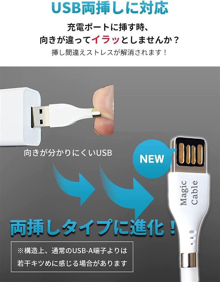 「USB-A両面挿し」対応となり、さらに利便性がアップ。 大注目のUSB充電ケーブルです。