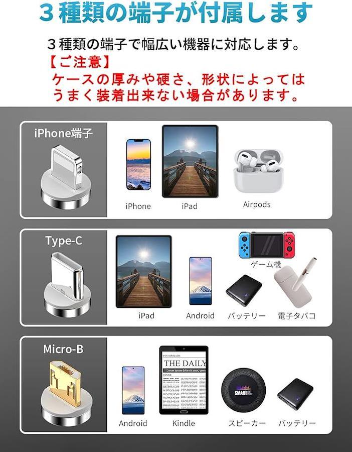 *Point(5) 3種類のスマホコネクタにマルチ対応 ・スマホの機種を選ばない。 ・3種類のマグネット式端子が標準装備(Type-C、iPhone互換端子、Micro-B) ・いずれの形状でもワンタッチ接続可能に。