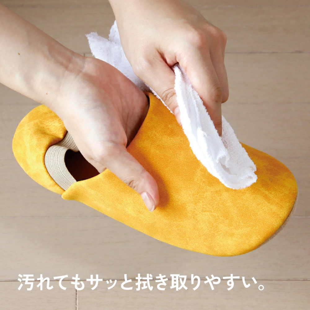 【商品情報】毎日使える、毎日備える。普段からもしもの時に備える防災ルームシューズ。実用性と防災性を兼ね備え、暮らしに安心感を。・高級感のあるアッパー素材を使用。日常に馴染むデザイン。・履きやすく脱ぎやすいのに、ピタっと足首に吸い付くようにフィットして走っても脱げにくい。・耐踏抜き性インソール内蔵で、ガラス片などの危険物から足を護ります。特殊なポリエステル多層構造加工の中敷きが釘やガラスの貫通を防ぎます。・左右兼用。・汚れてもサッと拭きやすく、手洗い可能。・コンパクトに折りたためます。