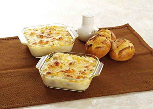 オーブントースターに並べて2個入る、一人分に便利なハーフサイズのオーブン皿です。耐熱ガラスだから、冷蔵庫からそのまま電子レンジ・オーブンの使用も大丈夫です。熱湯消毒もでき、いつまでも清潔ですね。塩・酸にも強く、臭い移りや色移りがありません。カレーやケチャップ料理など、色や臭いの強い料理も、洗うだけで簡単に落とせます。サイズ・重さ:約 外径14.4×12×3.9cm