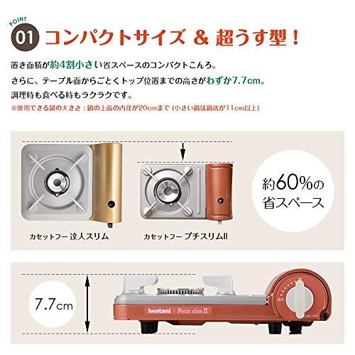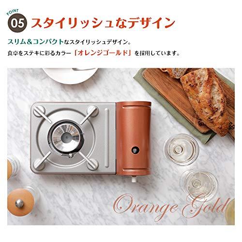 最大発熱量:1.86kW(1,600kcal/h)/連続燃焼時間:イワタニカセットガス使用時:約112分カセットガスジュニア使用時:約56分/商品重量:約1.0kg/カラー:オレンジゴールド