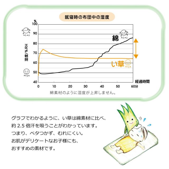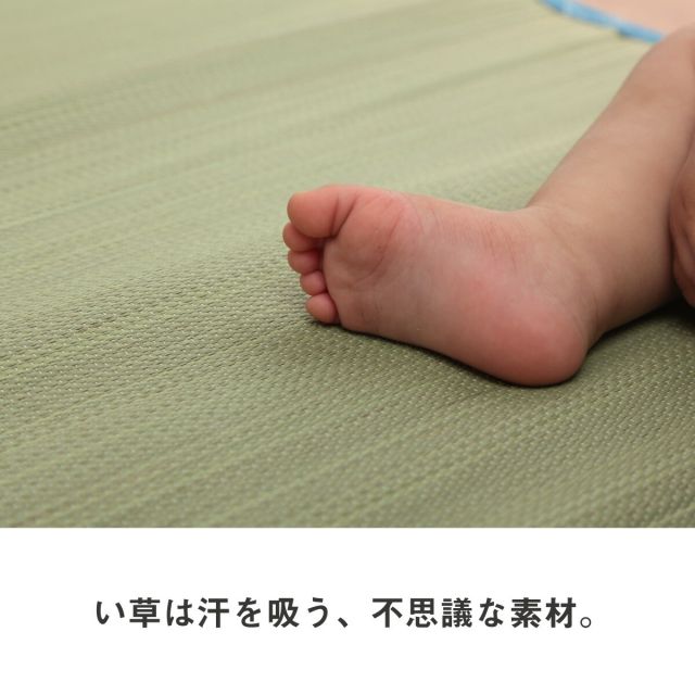 "安心の「日本製」で作ったベビー用い草シーツです。い草最大産地である九州産のい草を使用しております。洋室にも合うオシャレなデザイン。い草には汗などのジメジメ感を軽減する吸湿性と抗菌防臭などの効果があります。い草には汚れにくい性質があるので、定期的に乾いた雑巾や掃除機でゴミを取り除き、日陰干しをするだけで、お手入れ完了です。"