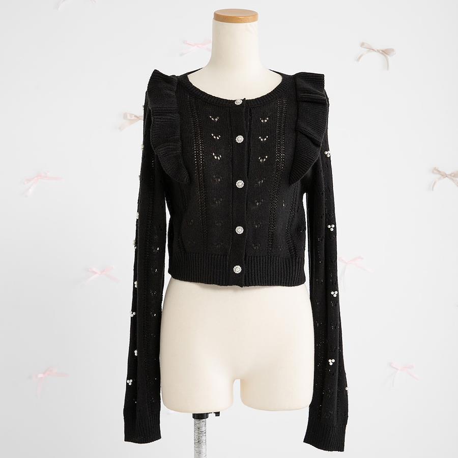 上品なパールビジュー釦のフリルニットカーディガンのご紹介。