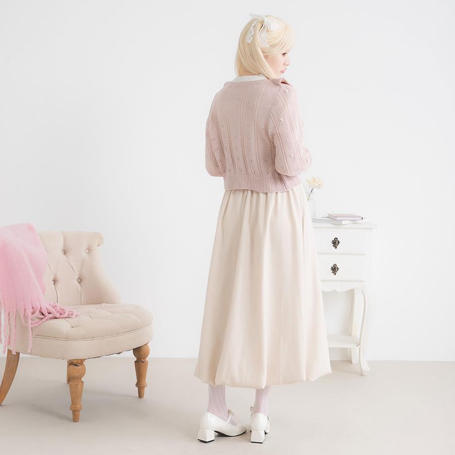 控えめなフリル、上品なパールビジュー釦、ハートに見える透かし編み、お袖のパール等、主役になりすぎずに細かいディテールにこだわって高見えするデザインにしました◎