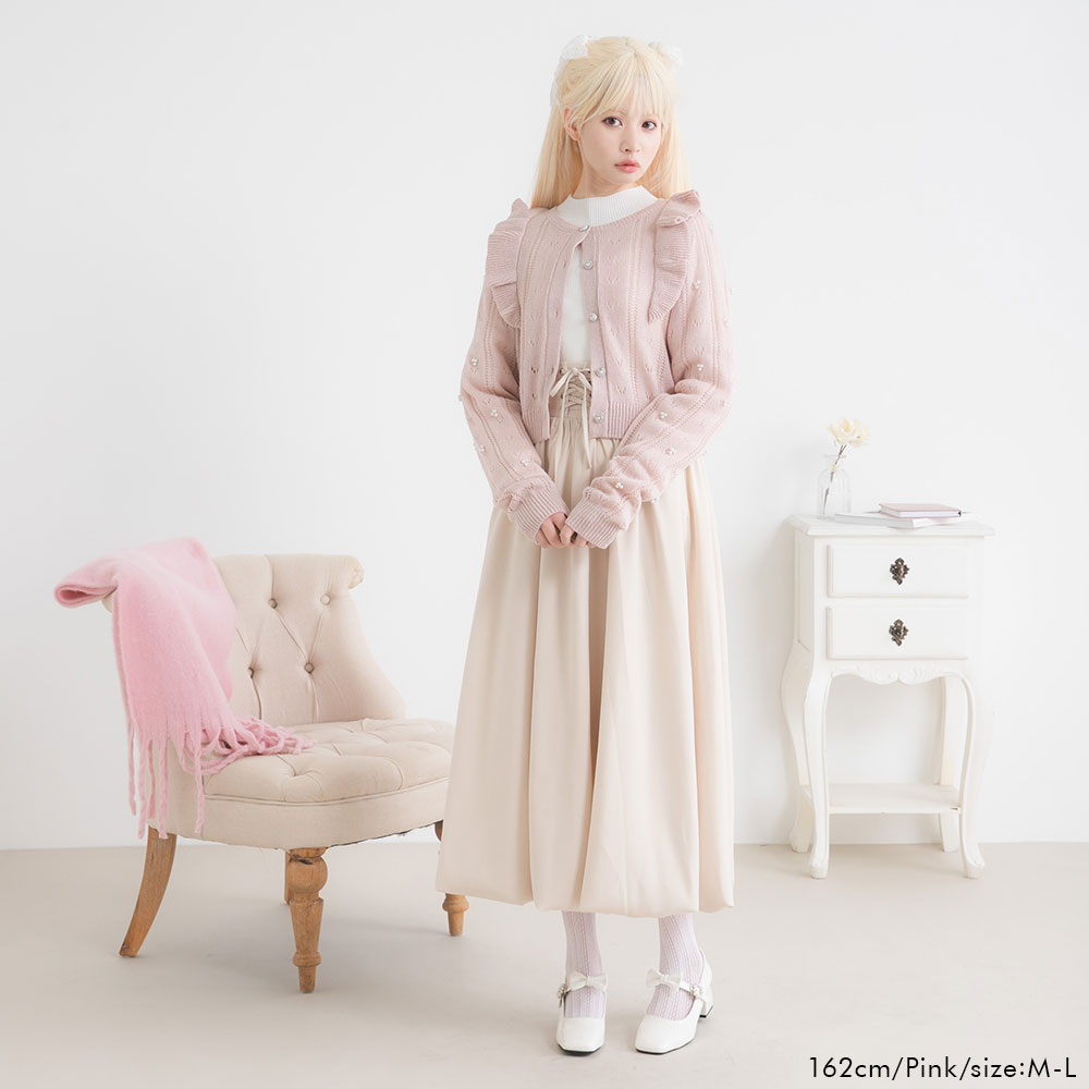 上品なパールビジュー釦のフリルニットカーディガンのご紹介。