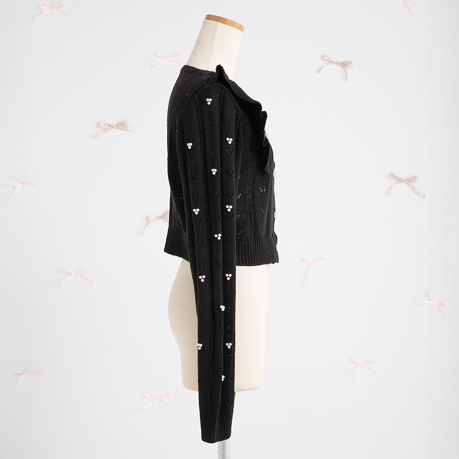 控えめなフリル、上品なパールビジュー釦、ハートに見える透かし編み、お袖のパール等、主役になりすぎずに細かいディテールにこだわって高見えするデザインにしました◎