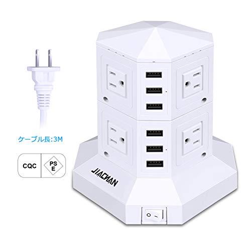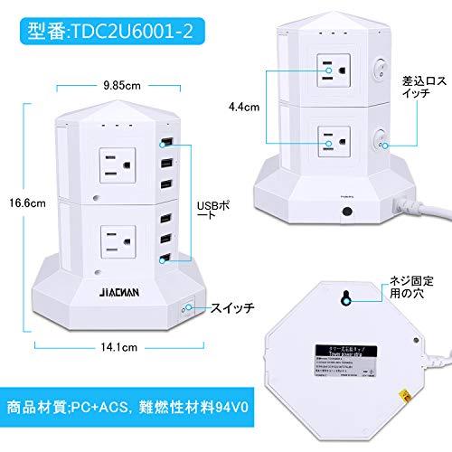 ●【JIACHANの利点】Jiachan USB付き電源タップはPSEで認証された工場でする高品質電子製品の製造を手がけるで設計・生産されています。●【頼りになる品質】本体は難燃性が最高クラスのPC樹脂素材と高品質の銅導体を採用し、電気火災の防止に有効です。そして、過負荷保護の回路デザイン及び防火材料により、過熱、過電流、ショートなどから充電した家電やデバイスを守ります。●【過負荷保護と雷ガード】電気使用安全のため、ブレーカーリセットボタンが搭載されています。一時出力オーバーでも自動的に電源をオフにして、電源タップや使用中のデバイスを保護します。また、雷が発生した時電源などを通って家に侵入するときでも、高電圧からお使いの電器をしっかり守ります。●【配線がスッキリ!】電器の配線や電源ケーブル、USBケーブルなどが集約ができって、配線がすっきりとなりました。AC挿入口は幅広設計で、電源アダプタが互いにじゃまがなくて挿入できます。部屋に置いても違和感がなく、逆にオシャレな感じがします。●【たっぷり!充電口】新型のタワー型デザインのJIACHAN電源タップは8個AC電源口と6つのUSBポートまで持っています。タブレットやスマホ、パソコン、小家電など同時に複数のデバイスに充電する可能です。タワーデザインの場合、電子機器が互いに干渉せずに使用できて、機器のコードは絡んだりすることが発生しませんというメリットもあります。
