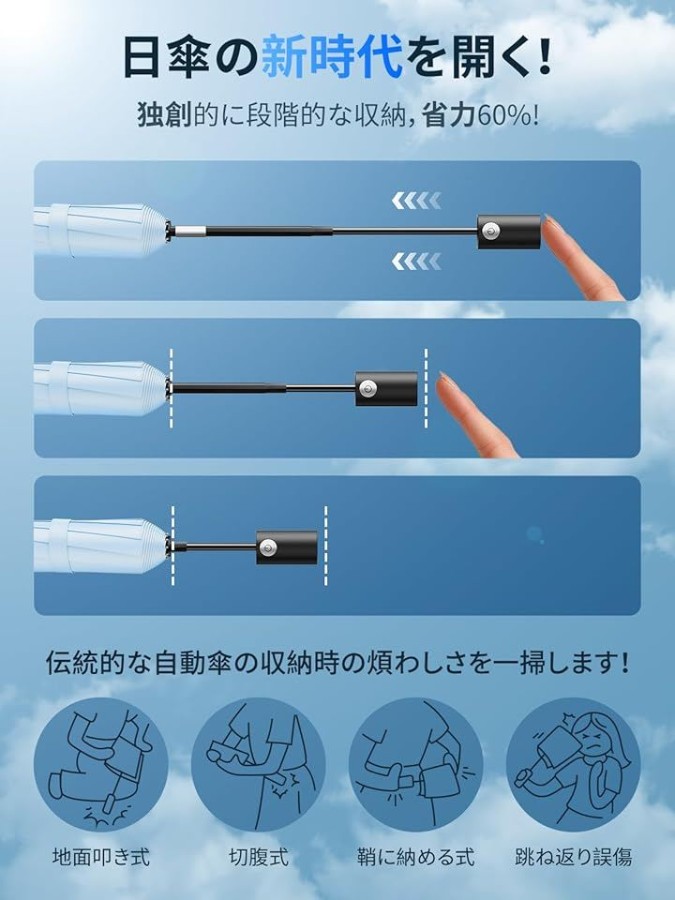 伝統的な自動傘の収納時の面倒さ(地面に叩く方法、切腹式収納、鞘に入れる方式、跳ね返りによる誤傷など)を一掃します。」