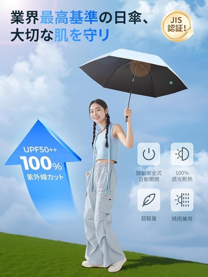 「JIS認証日傘・100%UVカット・100%遮光遮熱」UPEBの折りたたみ日傘は、一般の基準を100倍上回るJISの専門認証を獲得しています。