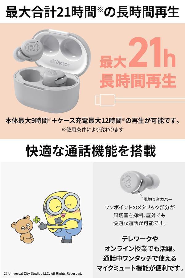 JVCケンウッド Victor HA-A30T-EH ワイヤレスイヤホン Bluetooth Ver5.2 ミニオン ノイズキャンセリング マイク付き 合計21時間再生 外音取込み機能 防水 IPX4 低遅延 テレワーク 小型 軽量 グレー