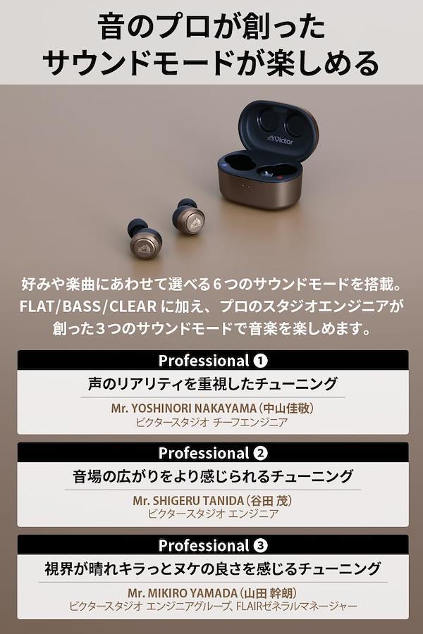 【スタジオエンジニアの個性が光るサウンドモードを搭載】好みや楽曲、シチュエーションで選べる6つのプリセットサウンドモードを搭載。FLAT/BASS/CLEARに加え、ビクタースタジオのエンジニア3名がそれぞれの音作りの個性を盛り込みチューニングを行った、PROFESSIONAL 1/2/3の3つのモードも搭載。・PROFESSIONAL 1:声のリアリティを重視したチューニング。ボーカルをフィーチャーした楽曲に。・PROFESSIONAL 2:自然な広がりを向上させたチューニング。様々なジャンルに。・PROFESSIONAL 3:解像感を上げ、ボーカルと楽器の分離を高めたチューニング。80~90年代洋楽に。【免責事項】メーカーによる商品リニューアルに伴いパッケージ(内容量も含む)変更が行われた場合、新パッケージでお届け致します事ご了承願います。