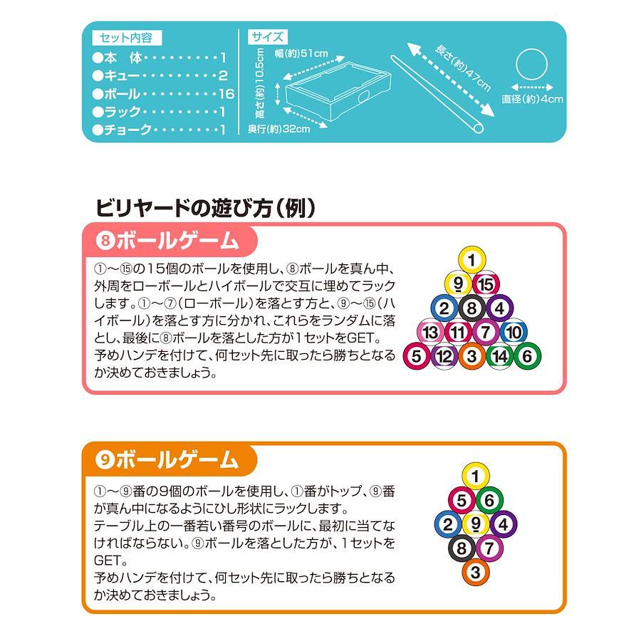 セット内容/ビリヤード台×1個・キュー×2個・球×16個・ラック×1個・チョーク×1個