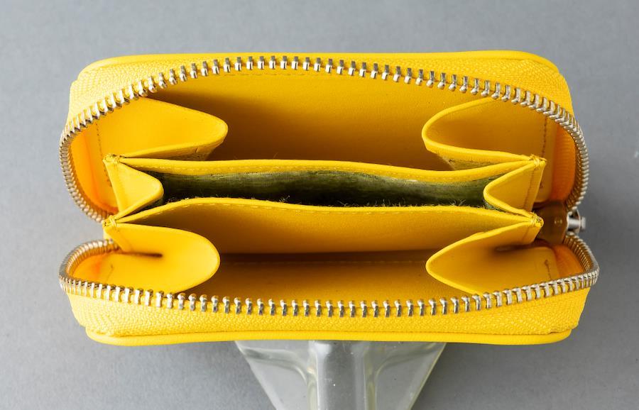 【KAWAORI】黄色のラウンド財布です。中に兵庫県の地場産業である播州織が使用されています。受注生産品ですのでご注文から発送まで、2ヶ月ほどお時間をいただきます。