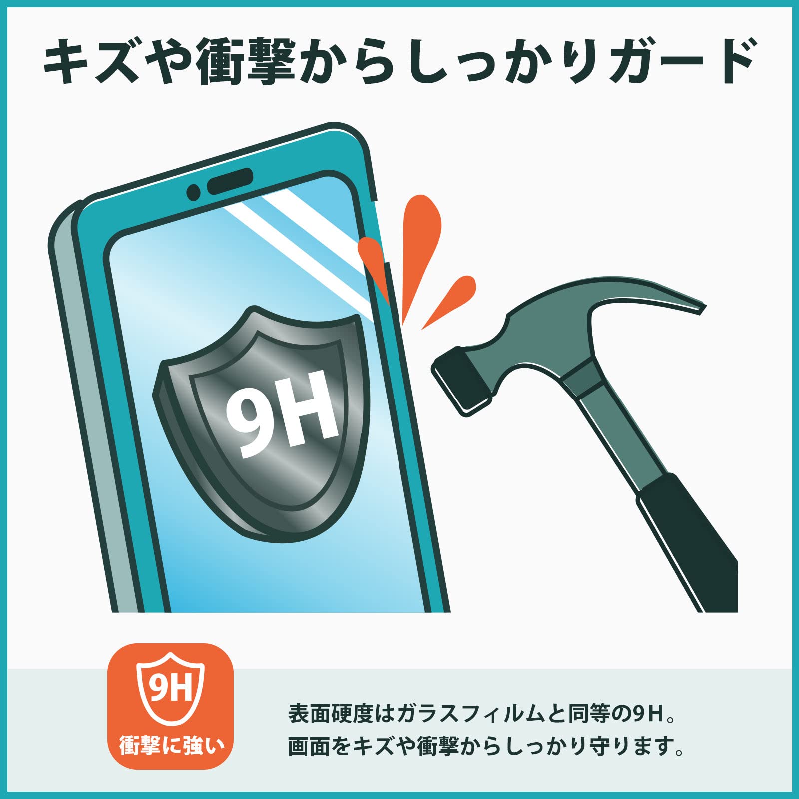 《1》表面硬度がガラスフィルムと同等の9Hと非常に強いので、画面を傷や衝撃からしっかり守ることができます。