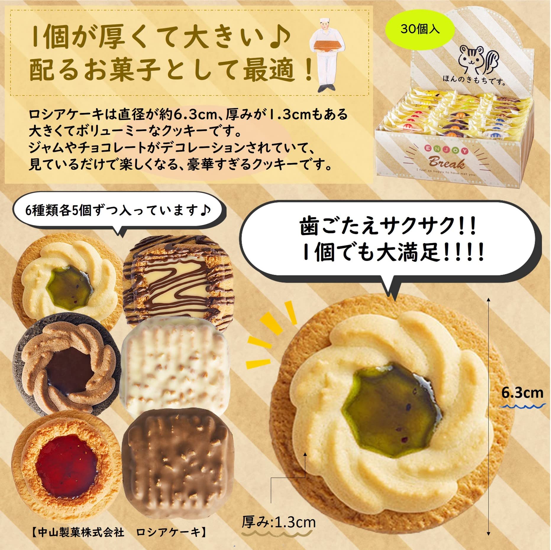 3営業日以内に発送≪新品未開封品≫【保管について】 直射日光の当たらない場所で保管ください。パッケージを組み立てて置くだけで挨拶になる御菓子です。中山製菓のロシアクッキーが6種類各5個、合計30個入っています。お菓子が割れないように、お菓子BOXを更に段ボールで梱包してあります。パッケージごと渡す菓子折りではございません。輸送中にお菓子が散乱する場合があります。個包装のフィルムにチョコレートが付着している場合があります。品質には問題ございません。退職時、産休時、異動、休職時のご挨拶や 敬老の日 母の日 父の日 お中元 お歳暮 の ギフト に御菓子 プレゼント にぴったりです。【重要】メーカーによる商品リニューアルに伴いパッケージ(内容量も含む)変更が行われた場合、新パッケージでお届け致します事ご了承願います。