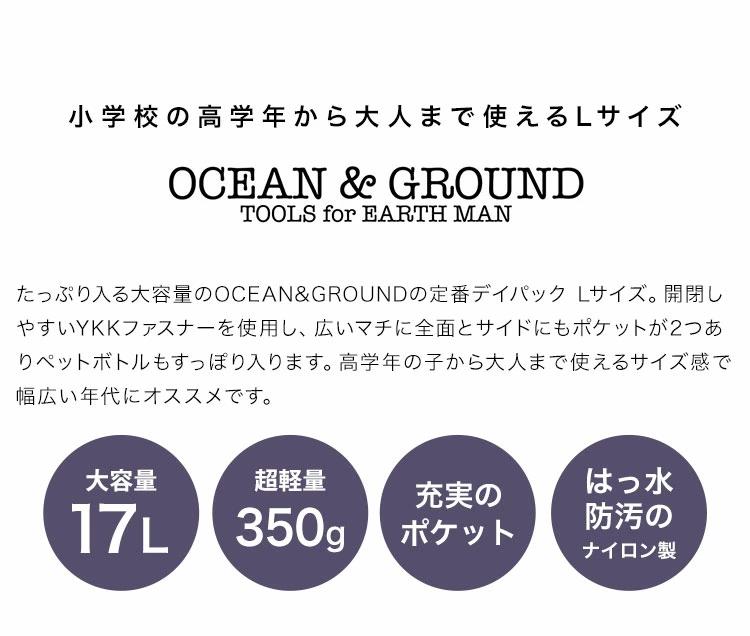 【デイパック GOODAY】小学校の高学年から、大人まで幅広い年代の方に◎たっぷり入る大容量のOCEAN&GROUNDの定番デイパック Lサイズ。開閉しやすいYKKファスナーを使用し、広いマチに全面とサイドにもポケットが2つありペットボトルもすっぽり入ります。高学年の子から大人まで使えるサイズ感で幅広い年代にオススメです。