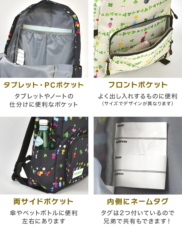 【タンサクデイパック】人気ゲームシリーズ『ピクミン』の世界観を表現したデイパックが登場!ジュニア(17L)とレギュラー(21L)の2サイズ展開。遠足やお出かけなど、普段使いもしやすいアイテムです♪A4サイズが入るメインポケット内はタブレットやPC収納もできるポケット付き。ネームタグは2枚ついているので兄弟姉妹で使える嬉しい仕様◎