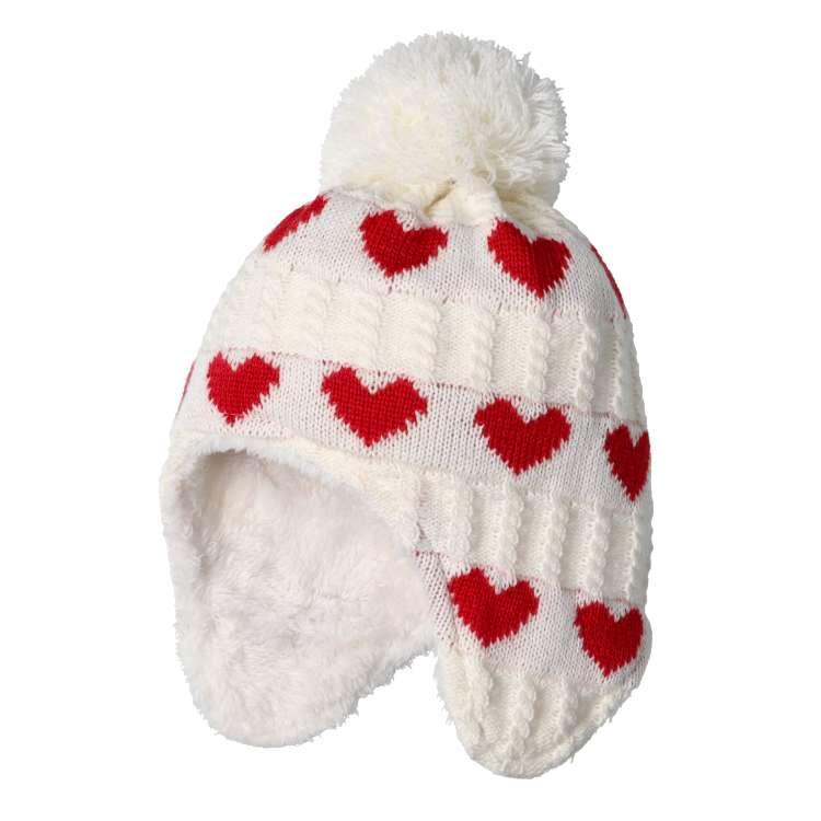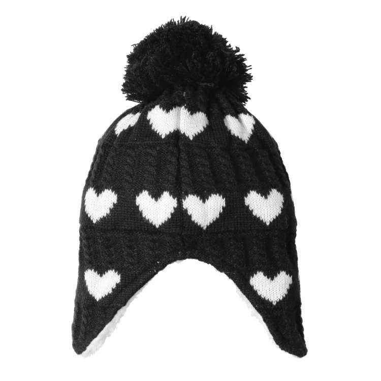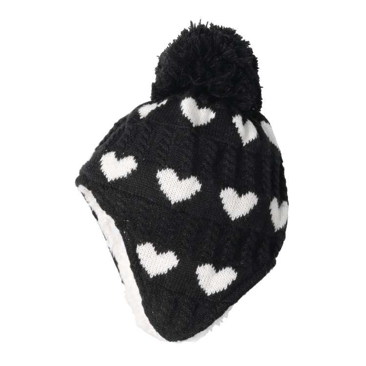 女の子らしいハート柄のアクリル素材のニット帽、帽子。耳も隠れるデザインに裏はボアで暖かく、可愛いだけでなく実用的。頭のてっぺんの大きなぼん天もポイント!同じ柄のスヌード、ネックウォーマー(B63808)、手袋(B63807)と合わせて着るのもオススメ!【アイテム】雑貨 カジュアル お洒落 オシャレ かっこいい かわいい 可愛い 普段着 デイリーウェア お出かけ 子ども こども 女児 女の子 ガールズ キッズ ベビーサイズ トドラーサイズ 幼稚園 保育園 小学校 通園 通学 小学生 遠足 旅行 2024年秋冬物新作 丸高衣料 小物 クリスマスプレゼント ギフト 誕生日 キッズフォーレ ブラック 黒色 オフホワイト 白色