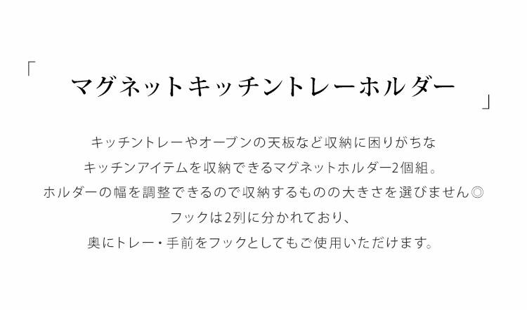 【マグネットキッチントレーホルダー 2個組】丁寧な暮らしをするおしゃれさんたちにお届けする、シンプルながらもアイデアのつまったtowerシリーズ。キッチントレーやオーブンやトースターの天板など収納に困りがちなキッチンアイテムを収納できるマグネットホルダー2個組。ホルダーの幅を調節できるので収納するものの大きさを選びません◎フックは2列に分かれており、奥にトレー・手前をフックとしてもご使用いただけます。