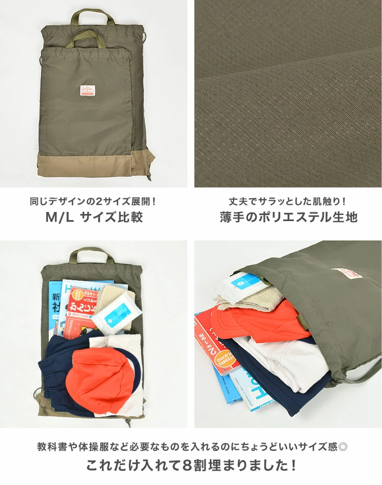 【ナップサック CAMP DAY】バイカラーのオシャレなデザインが人気のナップサック。ランドセルに入らない荷物を入れる用のサブバッグとしてやお出掛け、習い事にといろんなシーンで使いやすいアイテムです。巾着のようにキュっと絞るだけ。リュックとして背負えて、口部分に取っ手もあり便利です。アウトドアやスポーツシーンにも◎