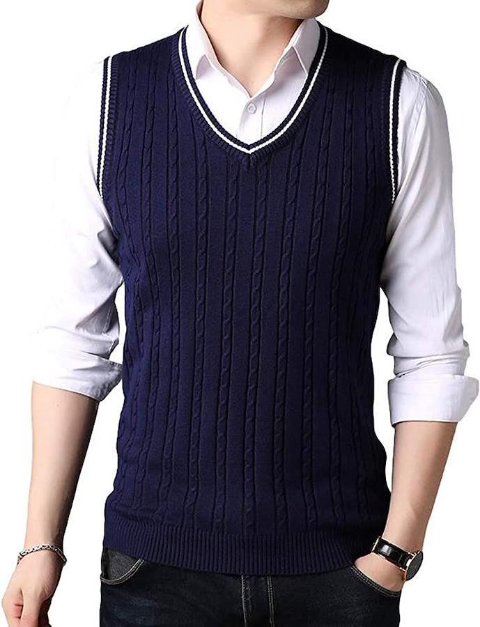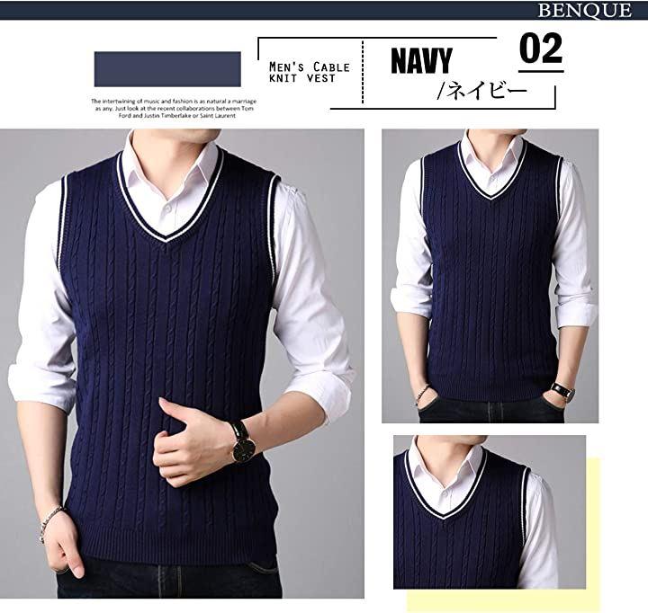 ビジネスにもカジュアルにも使いまわせる使い勝手の良いケーブル編みニットベストです。
