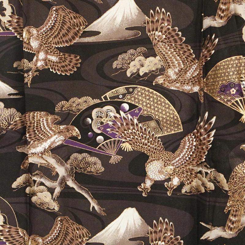 縁起柄である「富士と鷹」を総柄であしらった一枚。