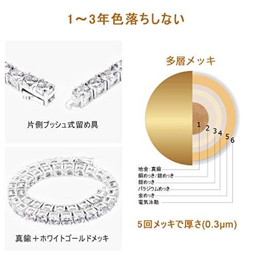 【存在感抜群の一品】幅4mmの大粒CZダイヤストーンを40粒以上配置したラグジュアリーなテニスブレスレットです。太過ぎず、細過ぎず、上品なバランスが毎日使いにとてもおすすめのサイズ感。定番ブレスに物足りなさを感じている人にぜひお勧めです。【手作業による爪留め】すべてのCZストーンは5A等級CZで、手作業による爪留めで埋め込まれており、安価なのり付けの品物とは異なるラグジュアリー感に溢れています。ストーンをできるだけ隠さない構造であるため、石が簡単に取れないし、ストーンの輝きがいっぱいに放出されます。【しっかりした作り】素材は展延性に優れる真鍮とホワイトゴールドのメッキ加工。5回もメッキ(0.3μm)をかけているため、耐食性にも優れ、汗などの影響を受けにくく、日常使用ではほとんど黒ずみや変色の心配はありません。いつでも美しく輝く!【より綺麗で長持ち】改良された留め具は、より美しく、より外れにくくなりました。良質なメッキを施したのでツヤ光沢、立体感も満点!普通に使用して1~3年色落ちしないといわれています。また、慎重なメンテナンスでさらに美しさを長持ちさせることができます。【1年間安心保証】12ヶ月日本国内の安心保証。万が一初期不良が発生した場合、お気軽にご連絡ください。お客様にご満足いただけるサービスを提供できるように努めます。※生産ロットにより、留め具の仕様は予告なく変更することがあります。あらかじめご了承ください。