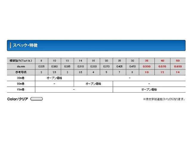 ■号数:2号 30m(8lb) 2.5号 30m(10lb) 3号 30m(12lb) 3.5号 20m(14lb) 4号 20m(16lb) 5号 20m(20lb)