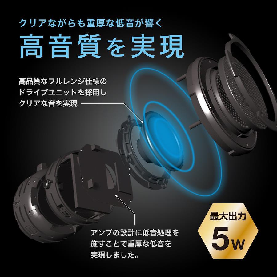 最大出力5Wでクリアな音が出る高品質ドライブユニットを採用し、アンプの低音処理設計で重厚な低音が響く幅広くバランスの良い高音質を実現しました。