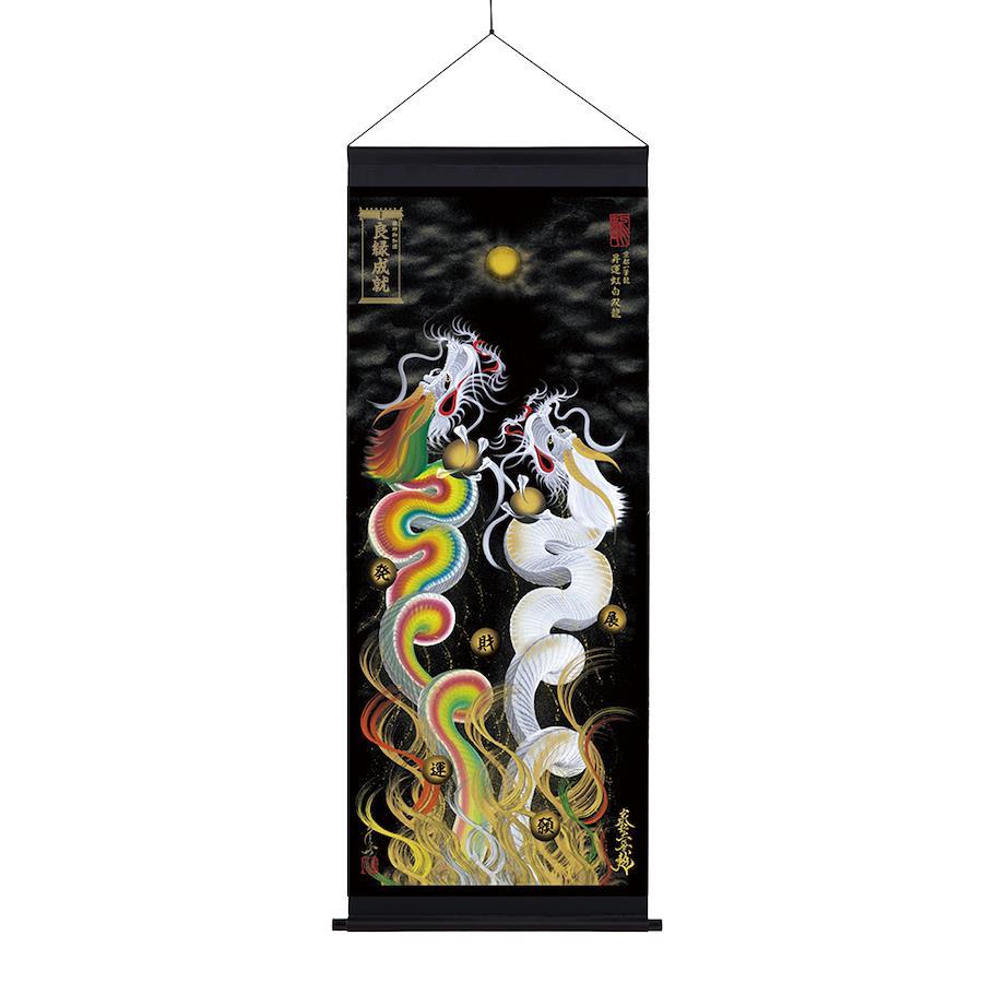 【商品の特徴】・京都一筆龍描画の種類/色彩は【26種】よりお選びいただけます<昇運龍14種(双龍5種/1体龍9種)> <守護龍10種(双龍2種/1体龍8種)> <縁結び龍2種(双龍2種)>・『京都一筆龍の御加護/御利益の象徴=胴体部分を一切途切れさせず一筆で描く動画』のQRコード印字ステッカー(2色/4サイズ)を同封お納めいたしております・描画に記載可能なお願い事は6種のご祈願内容より御選定いただけます心願成就/事業繁栄/金運上昇/健康祈願/家内安全/良縁成就・御札など添付のお祀り用マグネットを使用してお祀り(取り外し/位置変更可能)・発色が良く落ち着いた風合いの防炎スエード生地製(厚み約0.35~ ※官製郵便はがき約1.5枚程度/コピー用紙約4枚分程度)※ スエードは皮革・合成皮革ではなく専用布の名称となります。・吊り下げ用の上下軸棒付き(下部は軸先付き)※軸棒を外して飾られる場合でも、紐や止め具(画鋲、釘、ネジ等)をお使いいただけるハトメ穴付き(表面からは見えません)・丈夫で切れにくくシンプルな風合いの江戸打ち紐付き(黒/白2色)・龍の眼に光を宿し生気を吹き込む『龍の瞳(ラインストーン)』加工・京都一筆龍絵師手島啓輔署名、落款入り・御贈答のご利用も多く、懇切丁寧な包装