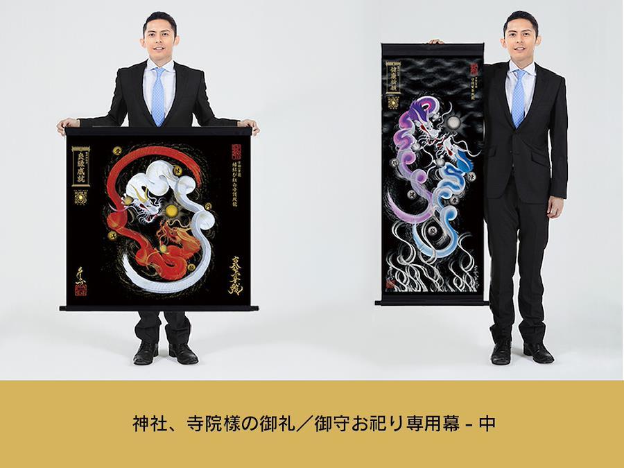 【商品の特徴】・京都一筆龍描画の種類/色彩は【26種】よりお選びいただけます<昇運龍14種(双龍5種/1体龍9種)> <守護龍10種(双龍2種/1体龍8種)> <縁結び龍2種(双龍2種)>・『京都一筆龍の御加護/御利益の象徴=胴体部分を一切途切れさせず一筆で描く動画』のQRコード印字ステッカー(2色/4サイズ)を同封お納めいたしております・描画に記載可能なお願い事は6種のご祈願内容より御選定いただけます心願成就/事業繁栄/金運上昇/健康祈願/家内安全/良縁成就・御札など添付のお祀り用マグネットを使用してお祀り(取り外し/位置変更可能)・発色が良く落ち着いた風合いの防炎スエード生地製(厚み約0.35~ ※官製郵便はがき約1.5枚程度/コピー用紙約4枚分程度)※ スエードは皮革・合成皮革ではなく専用布の名称となります。・吊り下げ用の上下軸棒付き(下部は軸先付き)※軸棒を外して飾られる場合でも、紐や止め具(画鋲、釘、ネジ等)をお使いいただけるハトメ穴付き(表面からは見えません)・丈夫で切れにくくシンプルな風合いの江戸打ち紐付き(黒/白2色)・龍の眼に光を宿し生気を吹き込む『龍の瞳(ラインストーン)』加工・京都一筆龍絵師手島啓輔署名、落款入り・御贈答のご利用も多く、懇切丁寧な包装