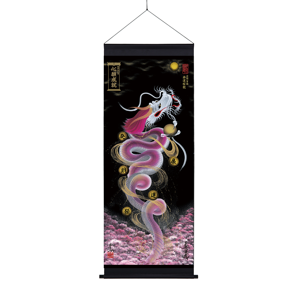 【商品の特徴】・京都一筆龍描画の種類/色彩は【26種】よりお選びいただけます<昇運龍14種(双龍5種/1体龍9種)> <守護龍10種(双龍2種/1体龍8種)> <縁結び龍2種(双龍2種)>・『京都一筆龍の御加護/御利益の象徴=胴体部分を一切途切れさせず一筆で描く動画』のQRコード印字ステッカー(2色/4サイズ)を同封お納めいたしております・描画に記載可能なお願い事は6種のご祈願内容より御選定いただけます心願成就/事業繁栄/金運上昇/健康祈願/家内安全/良縁成就・御札など添付のお祀り用マグネットを使用してお祀り(取り外し/位置変更可能)・発色が良く落ち着いた風合いの防炎スエード生地製(厚み約0.35~ ※官製郵便はがき約1.5枚程度/コピー用紙約4枚分程度)※ スエードは皮革・合成皮革ではなく専用布の名称となります。・吊り下げ用の上下軸棒付き(下部は軸先付き)※軸棒を外して飾られる場合でも、紐や止め具(画鋲、釘、ネジ等)をお使いいただけるハトメ穴付き(表面からは見えません)・丈夫で切れにくくシンプルな風合いの江戸打ち紐付き(黒/白2色)・龍の眼に光を宿し生気を吹き込む『龍の瞳(ラインストーン)』加工・京都一筆龍絵師手島啓輔署名、落款入り・御贈答のご利用も多く、懇切丁寧な包装