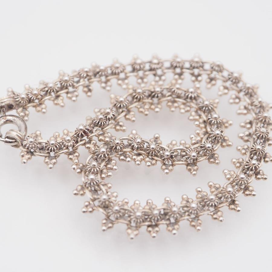 おそらく銀製かと思いますが、刻印が無いため断言できません。画像をたくさん掲載しておりますのでそちらでご確認とご判断をお願いいたします。
