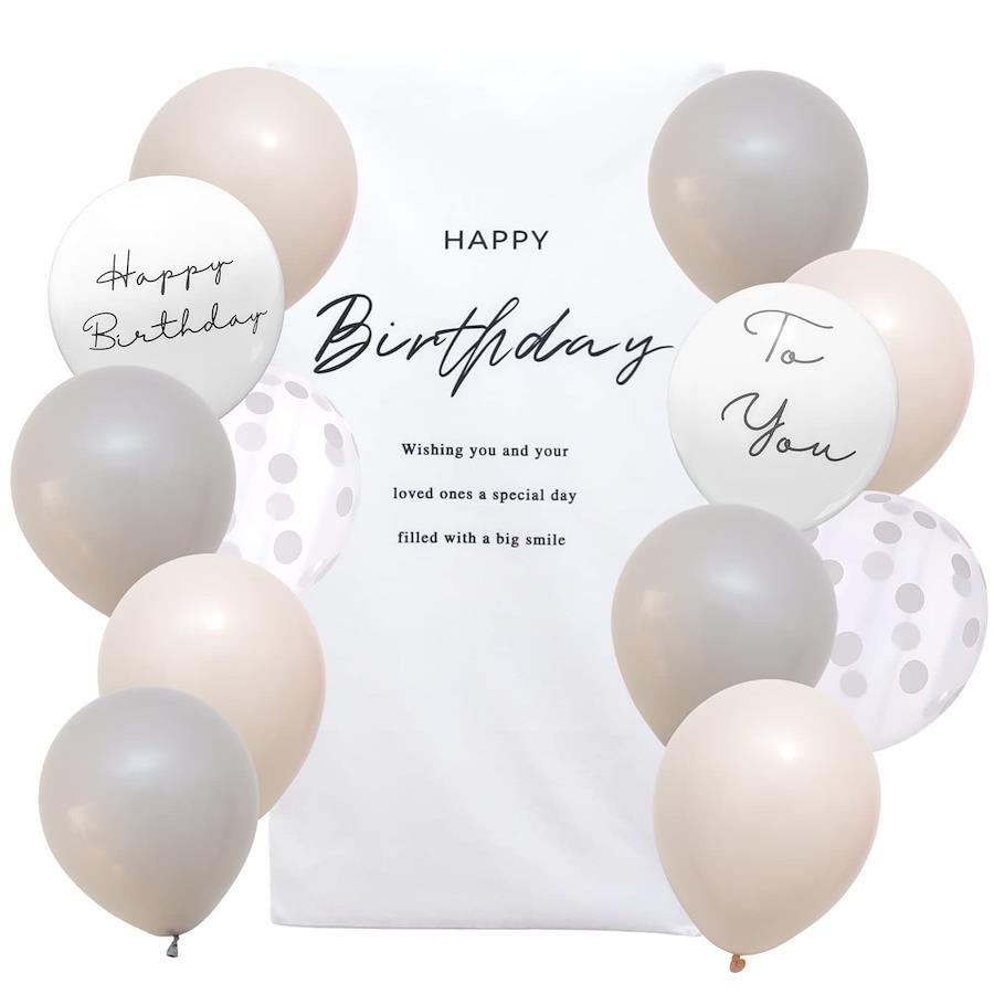 ?【大人気!くすみカラー】誕生日をおしゃれに彩るバースデータペストリーとくすみカラーバルーンです。既にセットされているので簡単にパーティー準備が出来ます。流行のニュアンスカラーバルーンは白い壁でもよく映え、よりおしゃれに可愛くパーティーを盛り上げてくれます! ?【シンプルでエコ】タペストリーは柔らかい生地でシンプルなデザインなので、インテリアによく馴染みます。丈夫な生地で、ご家族のお祝いに毎回毎年と繰り返し使えてとってもエコです。 ?【予備風船が付いて安心】タペストリー×1,表面Happy Birthday 裏面To Youの印字風船×2,グレージュ風船×4,グレー風船×4,クリアドット風船×2,シルバーカーリングリボン×1。この他に+各1個の風船付きだから安心して飾り付けが出来ます。 ?【サイズ・お手入れ方法】タペストリー 縦約85×横45cm 洗濯方法:洗濯ネットを使用して洗濯機洗い可。アイロン可。乾燥機不可。風船約25cm。膨らませ過ぎや温度変化、電化製品の近くも破裂の原因となります。お取り扱いにはお気をつけください。 ?【安心の日本企業】 日本国内にて1商品ごと丁寧に検品作業を行い、の倉庫より迅速に発送致します。La Kissaは日本国内のブランドなので万一のアフターサービスも日本人が責任を持って対応致します。