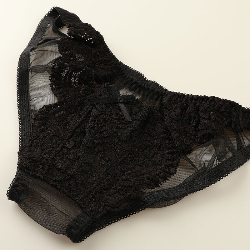 華やかで軽やかな質感を持ち、柔らかな触り心地と優美な透け感が魅力的なセクシーなシースルー素材の20ハーフ生地と透け感のあるストレッチレースを使用したフルバックショーツになります。フロントには秘密のポケットが付いたセクシーで遊び心のあるセクシーランジェリーになります。