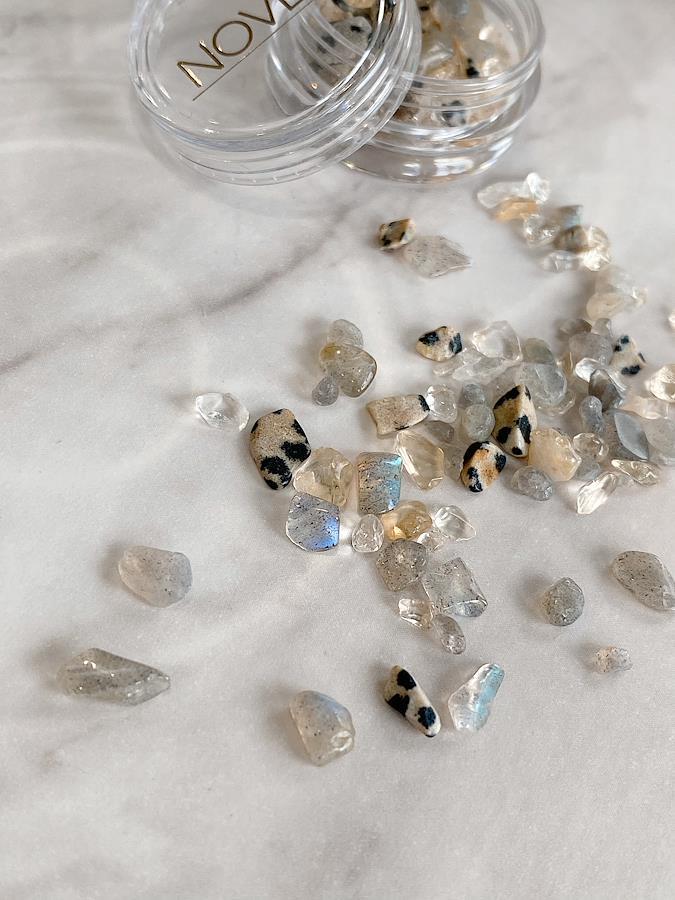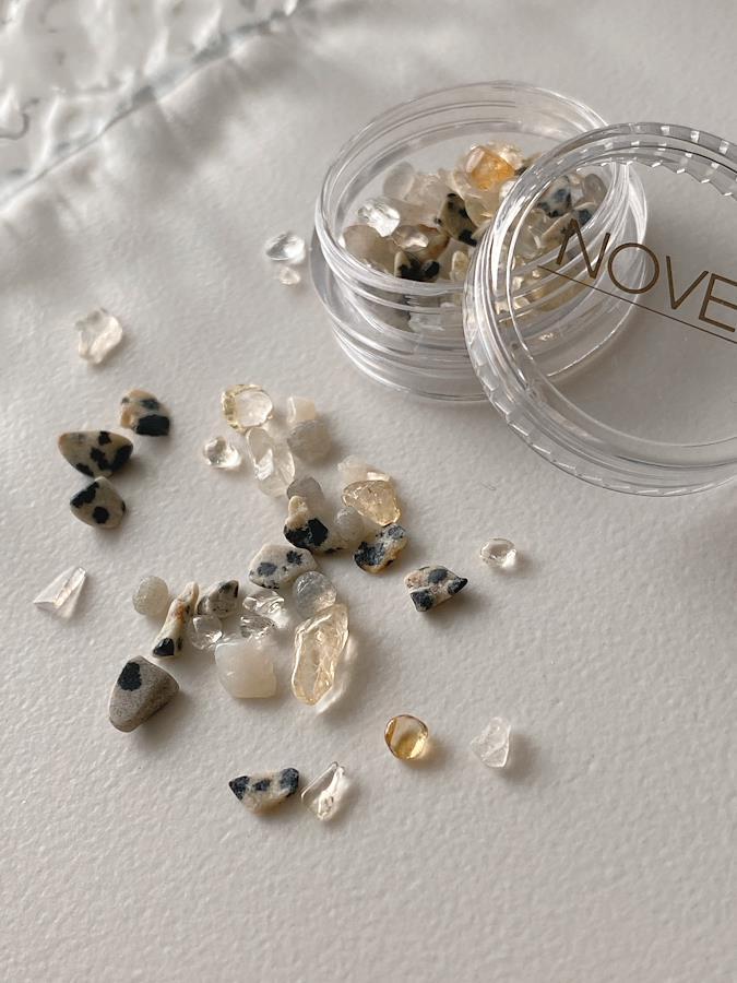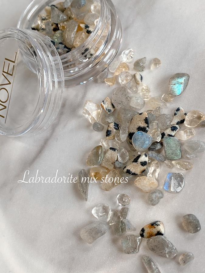 ラブラドライトとはほんのりブルーがかった輝きが美しい天然石の事で、ラブラドライトを中心にミックスされたニュアンスネイルや個性的なデザインにお使い頂けるようなストーンミックスになります。