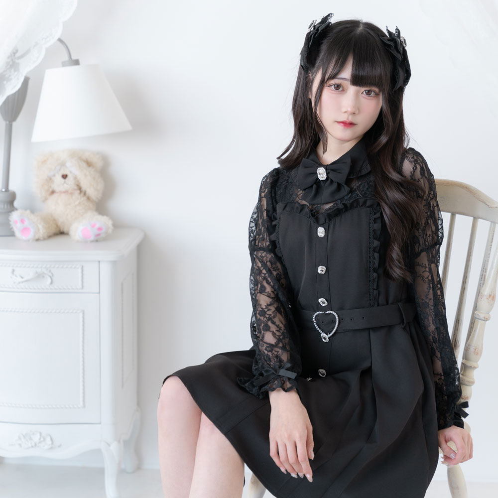袖とデコルテ部分がレースのドッキング風のワンピース♪【デザイン】レースのブラウスとビスチェワンピースを合わせているようなワンピースです。ウエストは後ろゴムで、ベルトでウエストが絞れます。衿部分のビジューリボンはブローチピンで取り外し可能。ネック部分の後ろが釦で涙明き、左脇ファスナーで着脱可能です。脇ポケット付きで一枚で映えるワンピースです♪【素材】本体はしっかりとした素材になっております。本体に裏地がついています。【コーディネート】量産型コーデにオススメのかわいいワンピース。デコルテ部分がレースで透けますので色のあったインナーの着用をおすすめします。《透け感》なし 《生地の厚さ》普通 《裏地》あり 《伸縮性》なし《生産国》中国