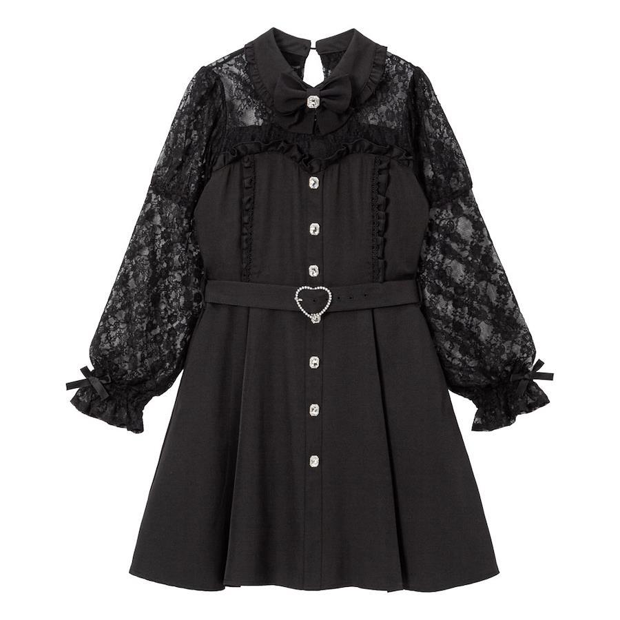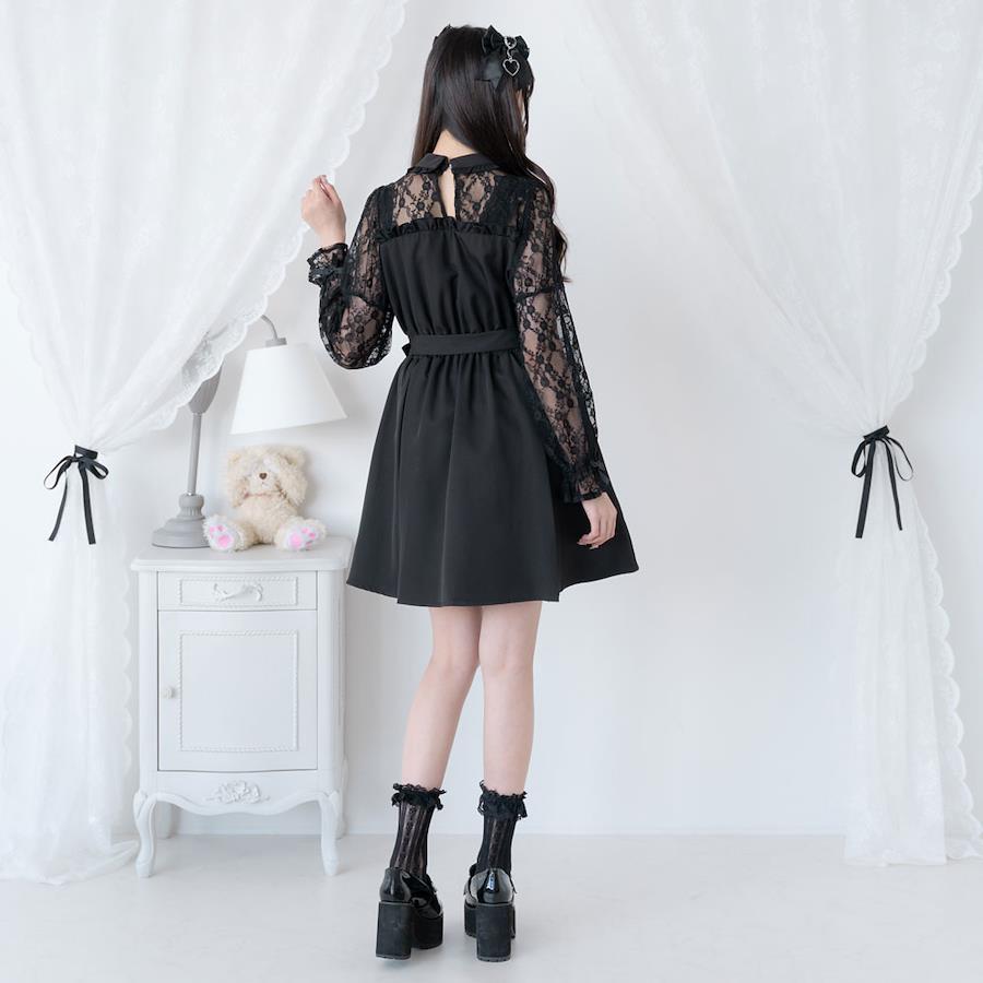 袖とデコルテ部分がレースのドッキング風のワンピース♪【デザイン】レースのブラウスとビスチェワンピースを合わせているようなワンピースです。ウエストは後ろゴムで、ベルトでウエストが絞れます。衿部分のビジューリボンはブローチピンで取り外し可能。ネック部分の後ろが釦で涙明き、左脇ファスナーで着脱可能です。脇ポケット付きで一枚で映えるワンピースです♪【素材】本体はしっかりとした素材になっております。本体に裏地がついています。【コーディネート】量産型コーデにオススメのかわいいワンピース。デコルテ部分がレースで透けますので色のあったインナーの着用をおすすめします。《透け感》なし 《生地の厚さ》普通 《裏地》あり 《伸縮性》なし《生産国》中国