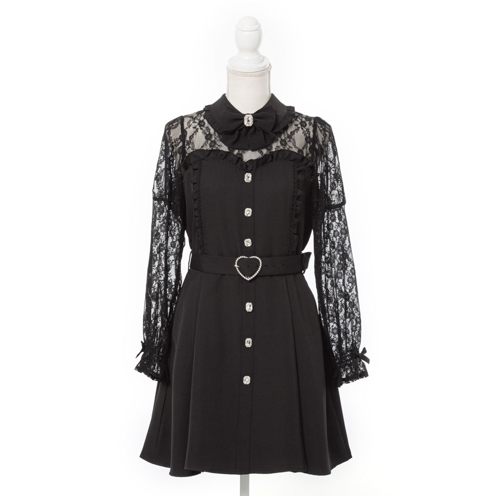 袖とデコルテ部分がレースのドッキング風のワンピース♪【デザイン】レースのブラウスとビスチェワンピースを合わせているようなワンピースです。ウエストは後ろゴムで、ベルトでウエストが絞れます。衿部分のビジューリボンはブローチピンで取り外し可能。ネック部分の後ろが釦で涙明き、左脇ファスナーで着脱可能です。脇ポケット付きで一枚で映えるワンピースです♪【素材】本体はしっかりとした素材になっております。本体に裏地がついています。【コーディネート】量産型コーデにオススメのかわいいワンピース。デコルテ部分がレースで透けますので色のあったインナーの着用をおすすめします。《透け感》なし 《生地の厚さ》普通 《裏地》あり 《伸縮性》なし《生産国》中国