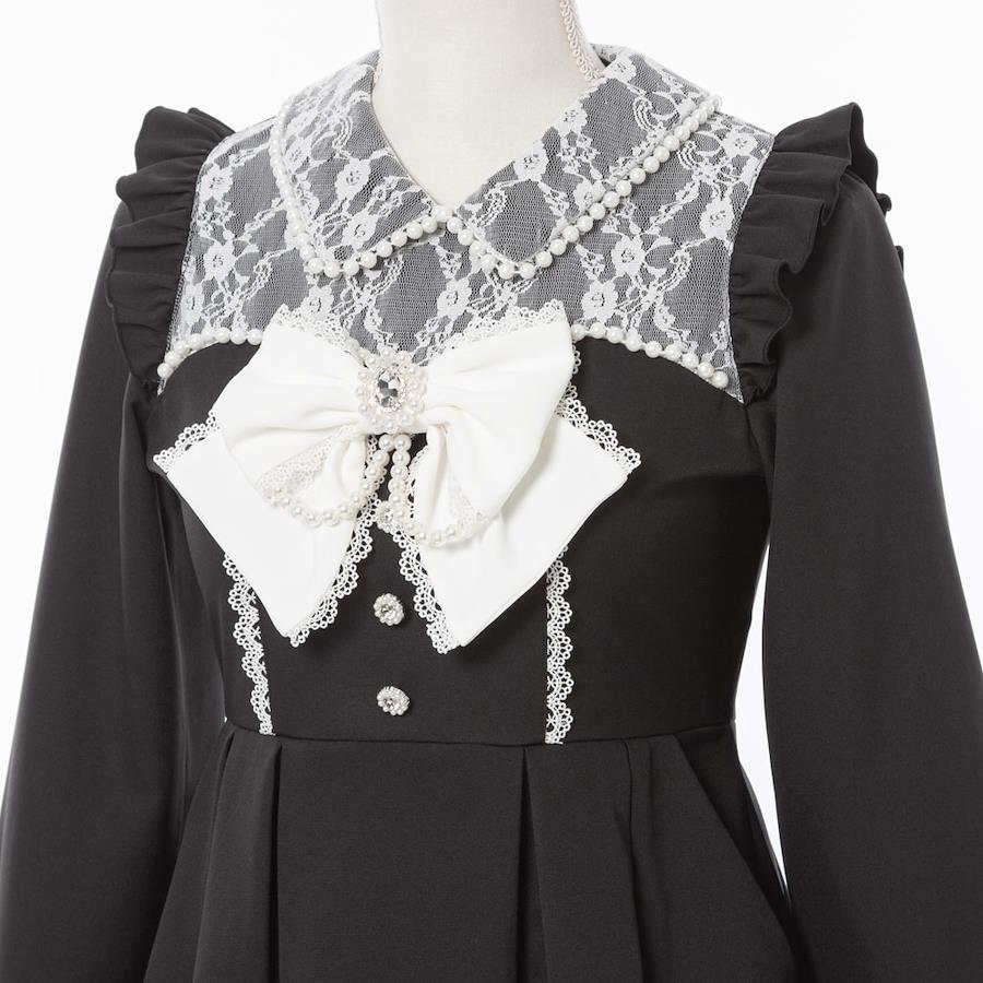 襟、身頃にあしらわれたパールがポイントのワンピースです。