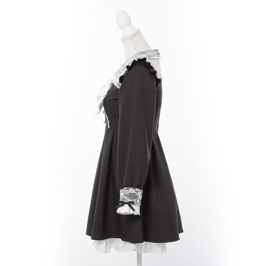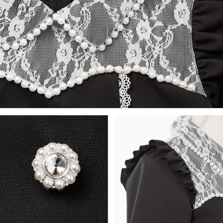 襟、身頃にあしらわれたパールがポイントのワンピースです。