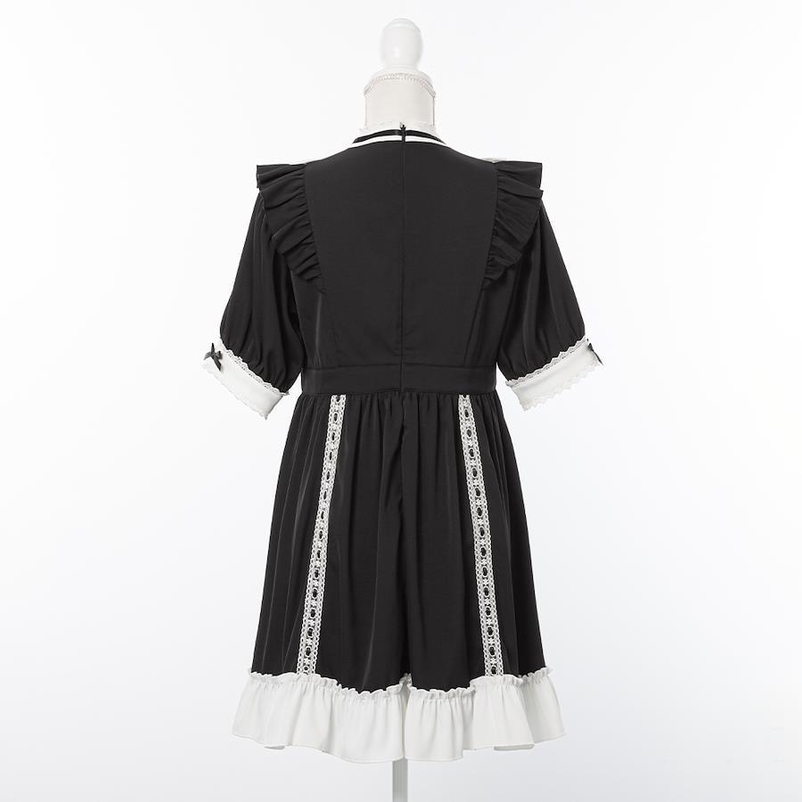 【デザイン】ヨークデザインと周りにたっぷり施したフリルが目を惹くデザイン♪フロントのビジューボタンとレースアップがさらに顔周りを映えさせてくれます。セットのリボンは首元に付けても、ヨークの下部分に付けてもどこに付けても可愛い◎スカートにもたっぷりのフリルと、はしごレースでかわいらしさをさらに詰め込みました。お人形気分になりたいあなたにおすすめのアイテムです♪