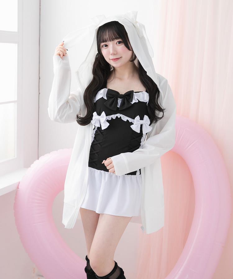 フリル×リボン×レースアップの甘さたっぷりなガーリーデザインの水着です。