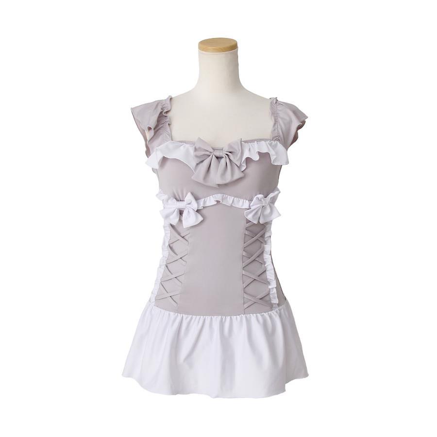 胸元には大きめリボンをあしらい、ウエスト部分にはレースアップ風デザインで細見江と可愛さを両立♪