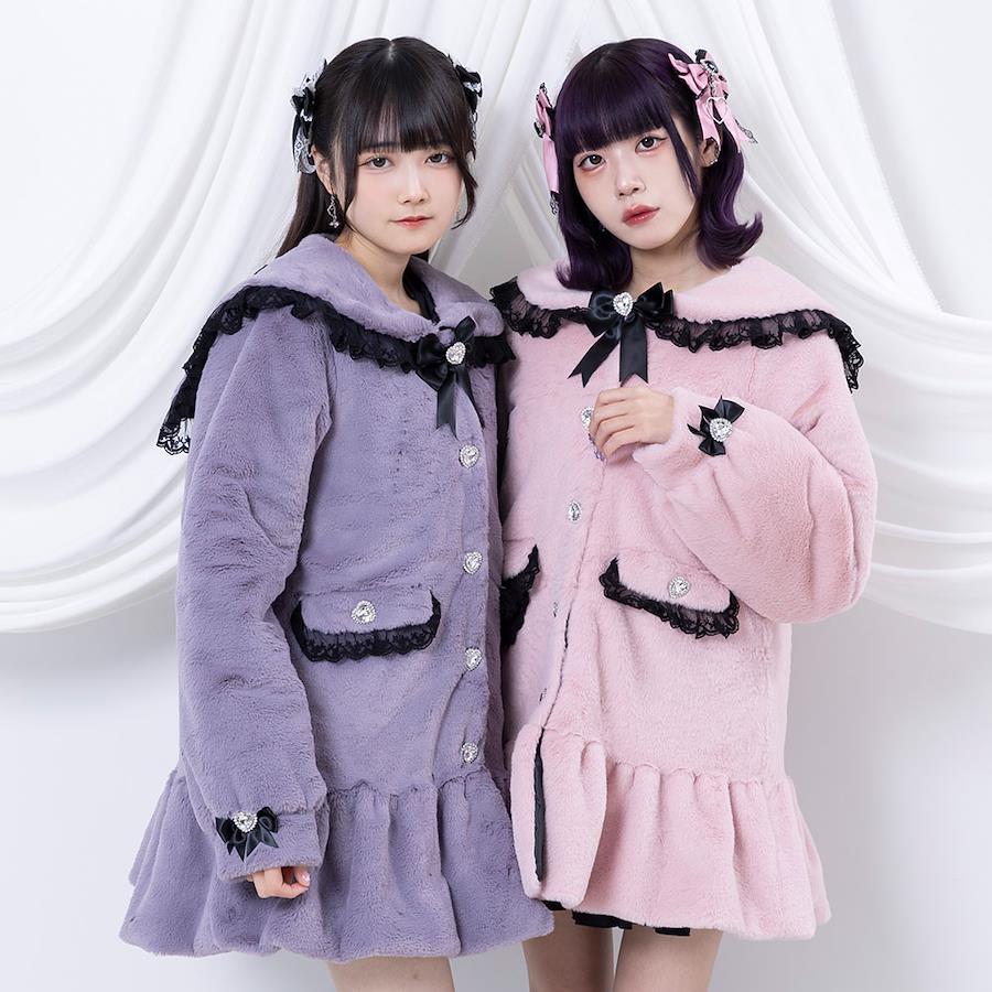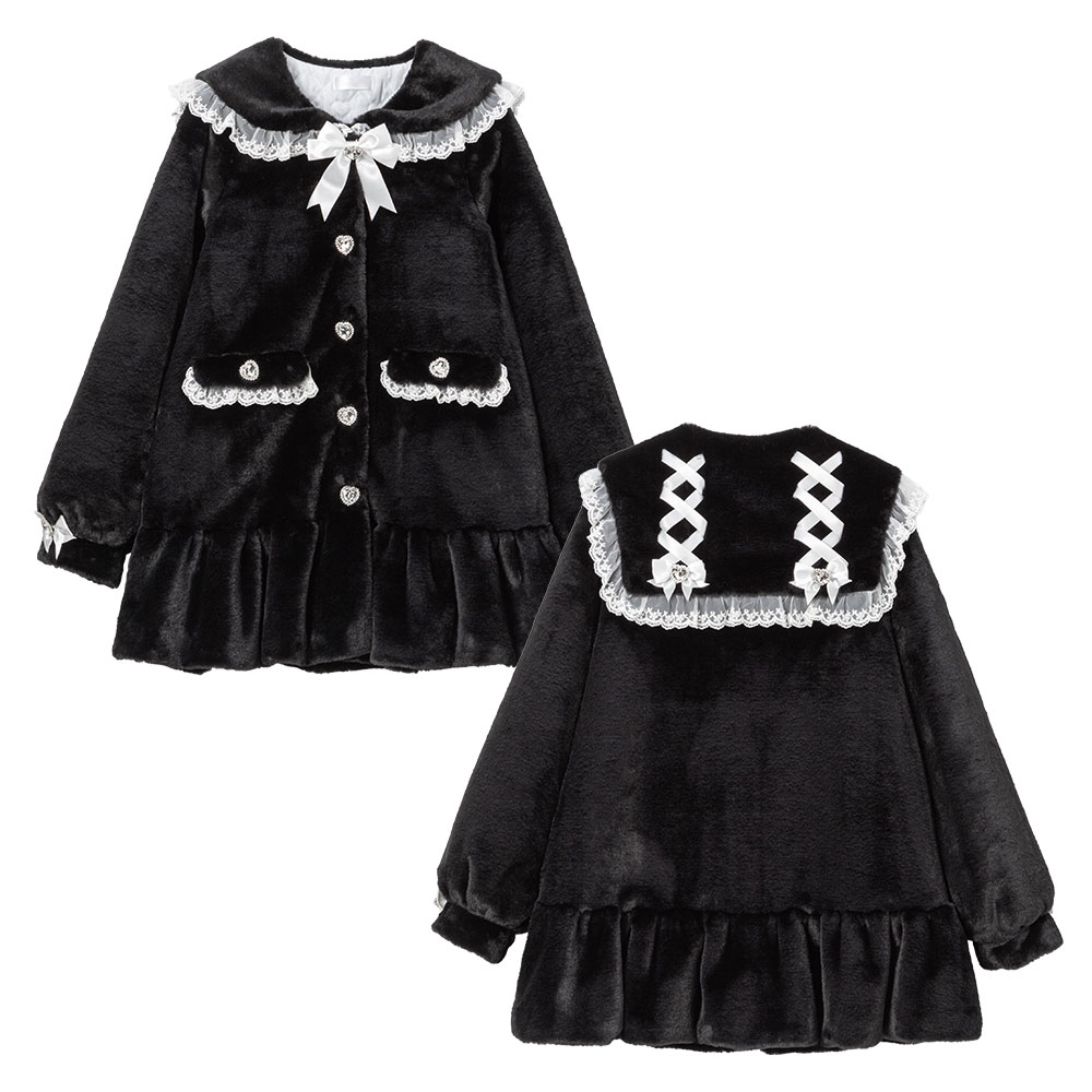 かわいいセーラー襟のふんわりファーコートが登場♪【デザイン】かわいいセーラー襟デザインのファーコートです♪フロントにはかわいいサテンリボンがついていてハートビジューがついています。釦部分にはキラキラのかわいいハートビジューボタン付き。シルエットはAラインでフレアがふんわりと広がります。襟部分にはかわいいレースがついています。袖口のカフス部分にもリボンがついていてワンポイントになっています。セーラー襟部分にはかわいいレースアップのデザインがあり、リボンもついているのもポイントです♪裏地には中綿入りのキルティングが入り暖かいファーコートです。【素材】表地はファー生地を使用しています。裏地には中綿入りのハートのキルティング生地を使用しています。スナップ釦にて釦の開閉ができます。【コーディネート】お気に入りのかわいいコーデにふんわりとしたかわいいコートを羽織ってお出掛けへ♪ミニ丈やすこし短めのワンピースを着用するとちらりとスカートの裾がチラ見えするのがまたかわいいです♪《透け感》なし 《生地の厚さ》厚手 《裏地》あり 《伸縮性》なし《生産国》中国