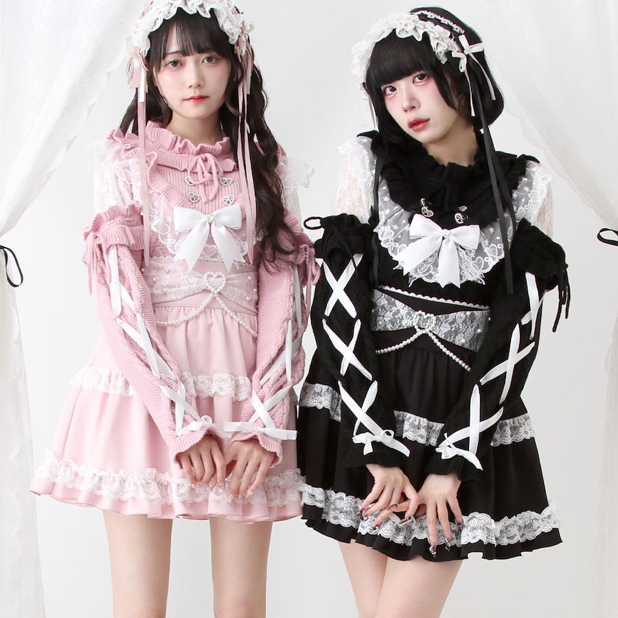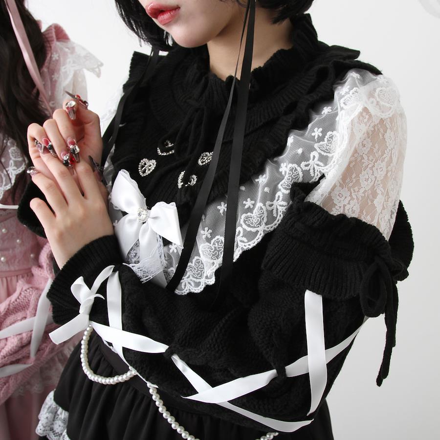袖レースアップフリルハートビジューニットトップス【デザイン】ハイネックのニットトップスになります。襟部分のフリルがたくさんあって、お好みで調節可能ヨーク部分はキラキラビジューハートリボン釦が付いてます。ハート柄のレースフリルもかわいいポイント♪肩袖部分はレースで透けて肌チラッと見えるのもかわいい配色のレースアップもあり、横から見るも甘かわいい【素材】伸縮性と落ち感のあるニット素材で、春も着やすいサラッとした素材感です。【コーディネート】冬や春にも着れるニットトップス♪甘めコーデにピッタリのアイテムになります。スカートにインするのがオススメです。《透け感》カラーによってあり 《生地の厚さ》普通 《裏地》なし 《伸縮性》ややあり《生産国》中国